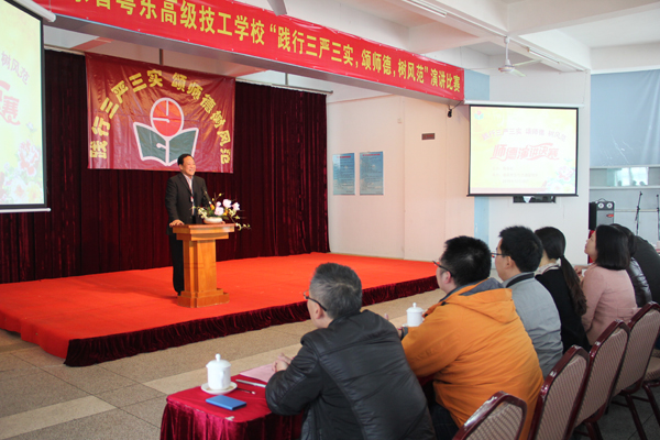 比赛开始前,党委书记廖镇坑致辞,要求全体教职工对照“三严三实”的要求,认真开展“修身、用权、律己”学习活动,争做师德高尚、技艺高强、德能双馨的优秀教师。廖书记希望全体教师能在比赛中将师德内化于心、外化于行,用实际行动促进为我校创建“粤东地区技工教育示范窗口”增添生机。随后,教务处处长赵亚莉宣读比赛规则。