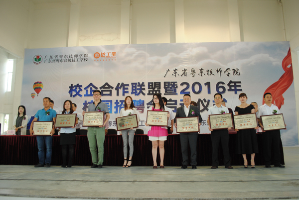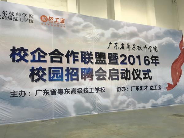 2016年5月16日上午,广东省粤东技师学院校企合作联盟暨2016年校园招聘会启动仪式在学院北山湾校区隆重举行。汕头市人大常委会副主任黄晖阳、汕头市人力资源和社会保障局调研员林娜、濠江区政府副区长黄树平等领导出席仪式。广东汇才人力资源有限公司、汕头市检验检测协会、汕头龙光喜来登酒店、东莞市万科物业有限公司、北京新大陆时代教育科技有限公司等70多家企业加入该校校企合作联盟;来自粤东地区、广州、深圳等地的200多家名优企业进校园招聘,为学院2000多名毕业生和顶岗实习学生提供近6000个岗位。