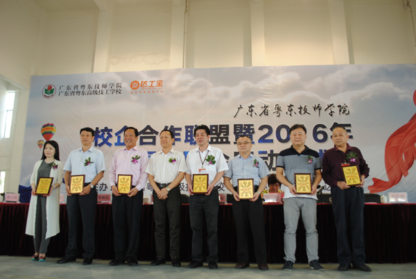 上午10:00,广东省粤东技师学院校企合作联盟暨2016年校园招聘会启动仪式正式举行。汕头市领导,汕头市人社局、濠江区和省粤东技师学院等单位领导为学院校企合作联盟理事单位授牌,学院院长黄志、党委书记廖镇坑以及企业代表、汕头市信一塑机制造有限公司总经理陈远平分别启动仪式上在发言,都表示要加大力度合作力度,校企携手促进技工教育对接市场需求,不断提升高技能人才培养质量。
