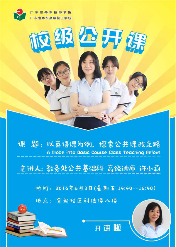 2016年6月3日,由公共基础科英语高级讲师许小莉老师主讲的校级公开课在学校金新校区举行。黄志校长、彭贵福副校长、各处室负责人等200余名师生到场观摩。