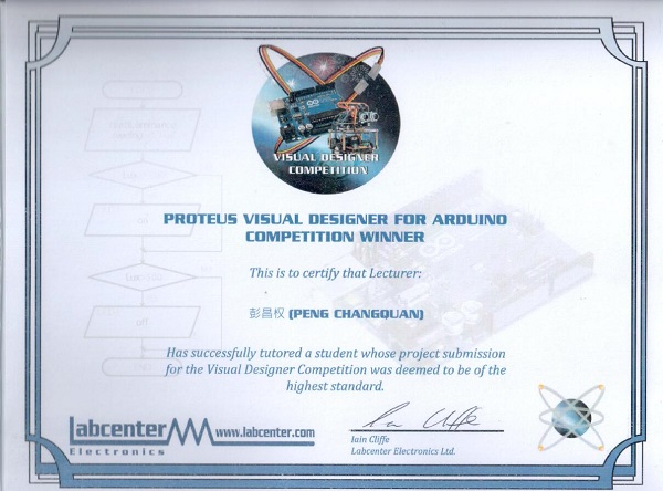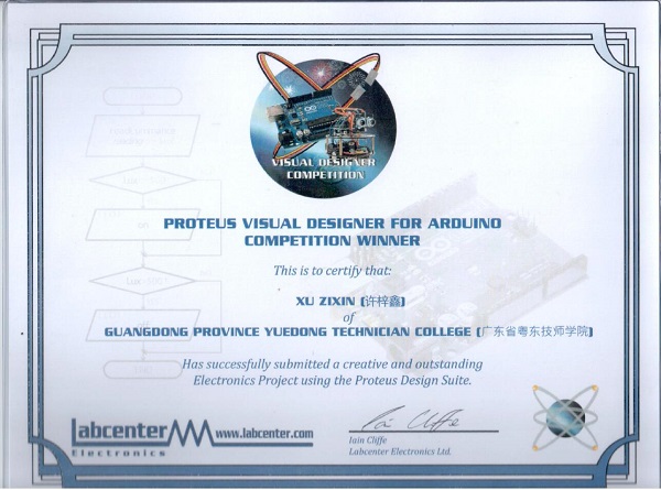 本次大赛由英国labcenter公司主办,广州市风标电子技术有限公司承办。中国赛区共有包括中山大学、汕头大学、深圳大学、中国农业大学、中国矿业大学等79所院校1685位学生报名参赛。所有参赛作品均由大赛主办方英国labcenter公司在英国组织评审小组进行评审,根据所提交作品的创新性、实用性、复杂性和项目总结进行评分,最终在中国赛区共选出39个优胜作品。值得一提的是,在39个获奖作品中,仅我校许梓鑫同学的作品来自技工院校,其他都是各类本科或高职院校。