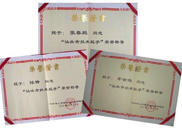 2016年5月,我院电气工程系陈锋、张春鹏、李世源等3位老师被授予“汕头市技术能手”荣誉称号。