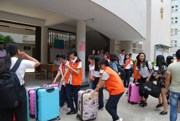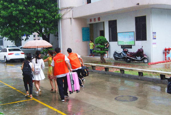从饶平来金新校区报到的一名化工专业的新生,全家出动,对于志愿者贴心周到的服务,这名新生的爸爸憨笑着说:“这些志愿者很贴心,我进校门口时,那边就有一个志愿者看我走过来,便主动上前提行李,协助我的孩子完成新生报到注册。北山湾校区的迎新工作也在如火如荼的进行中,一位想帮孩子购置生活用品的家长因找不到超市的方位在校道徘徊,通过我们志愿者的帮助,顺利的找到了超市。接受记者采访时,这位家长谈到,“学校的迎新工作做得不错,一路上都有牌子提示,也有志愿者帮忙提行李,指路等等,分工很明确。”接受采访的新生、家长们,都对学生志愿者的工作赞叹有加,感谢他们周到细心的服务。