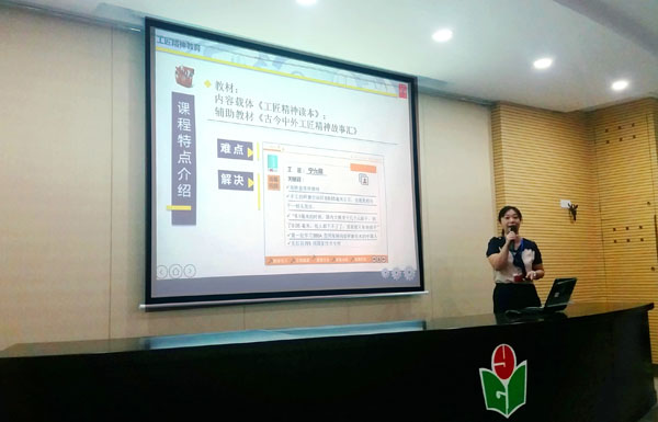 培训由高级讲师许小莉主讲。许老师将培训内容分成课程研发背景、课程特点介绍和教学资源使用建议三个板块,通过讲解课程和教材特点、根据教材内容巧妙设计课堂活动、灵活使用教学资源、以任务驱动方式引导学生主动探究工匠精神等内容,确保教学效果。同时,她还建议班主任可利用《工匠精神读本》和《古今中外工匠精神故事汇》两本教材培养学生“课外多阅读,课内谈感想”的良好习惯;提议课程考核应侧重过程性评价、学生情感和能力的提升,考核方式可多样化的。此外,许老师还向大家分享了《工匠精神教育》课程教学资源。